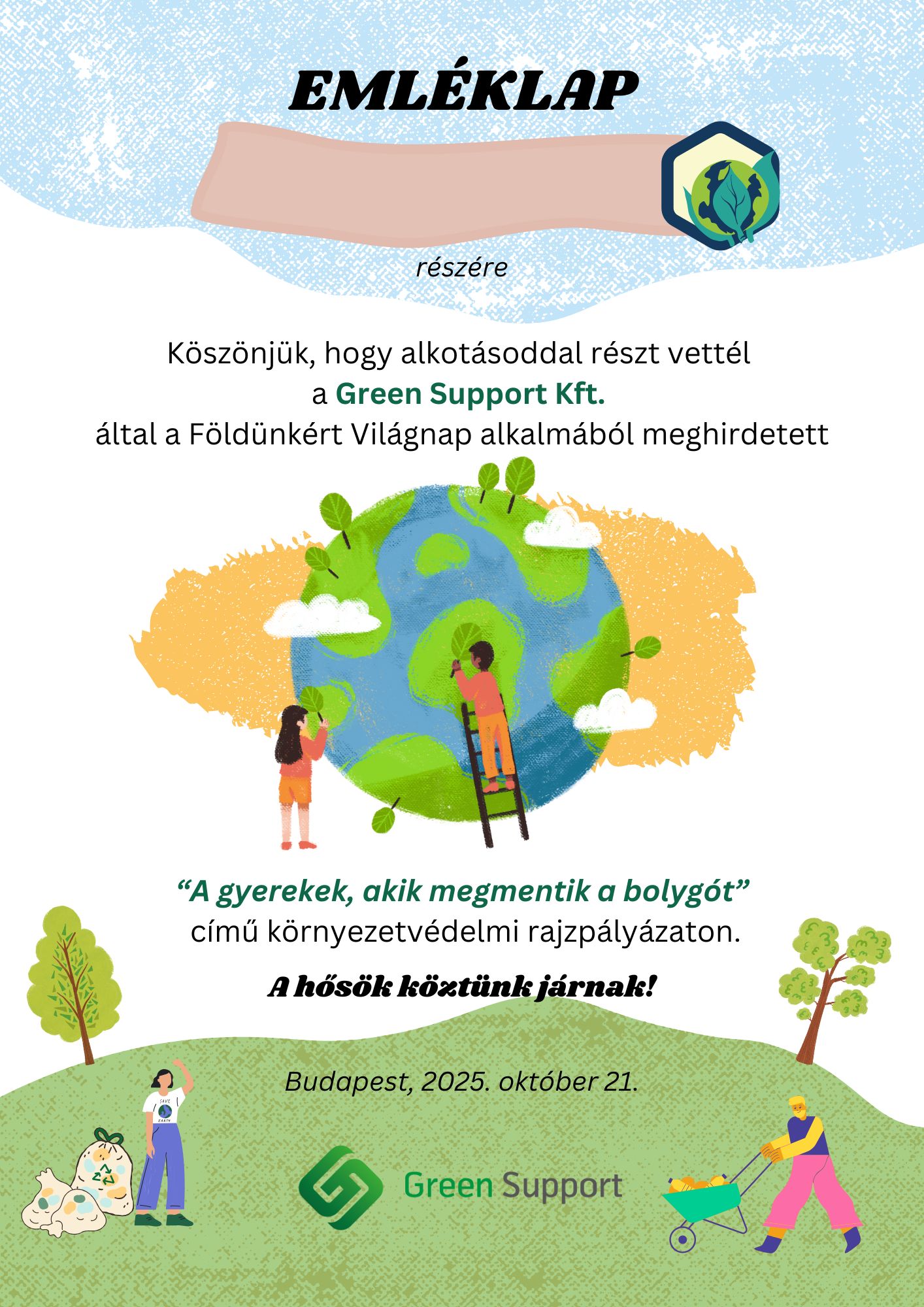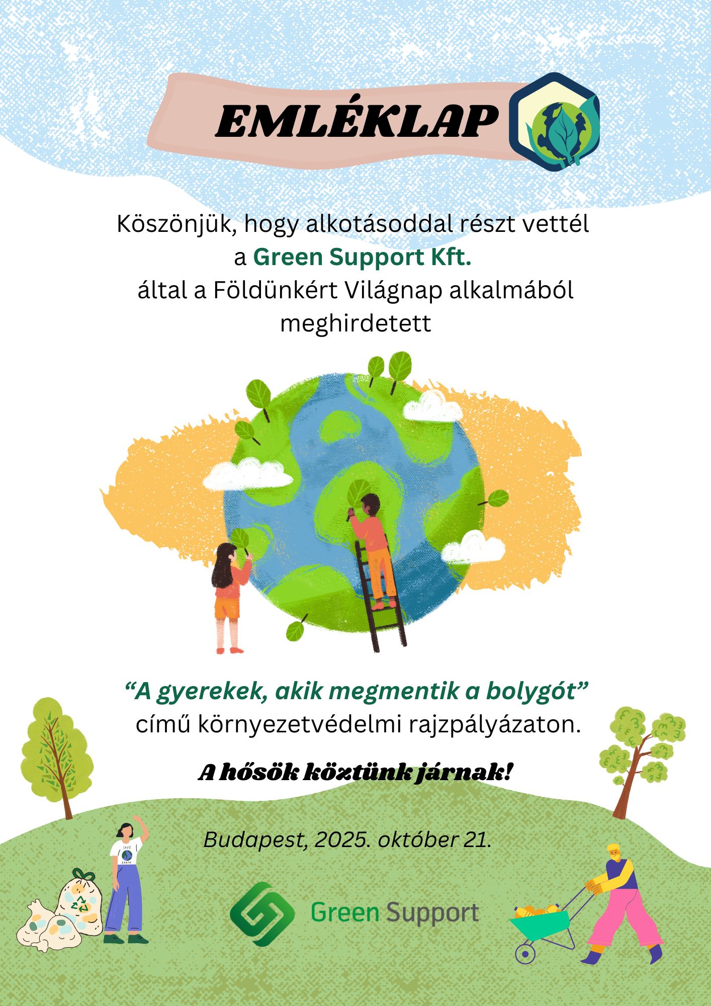 A FÖLDÜNKÉRT VILÁGNAP alkalmából a Green Support Kft. a környezettudatosság jegyében környezetvédelmi rajzpályázatot hirdetett alsó tagozatos általános iskolások részére „A gyerekek, akik megmentik a bolygót” címmel. A résztvevő kreatív és alkotni vágyó gyerekek rajzaikon keresztül mutathatták be, mit tudtak tenni Földünk védelmének érdekében tenni, mint kis szuperhősök.